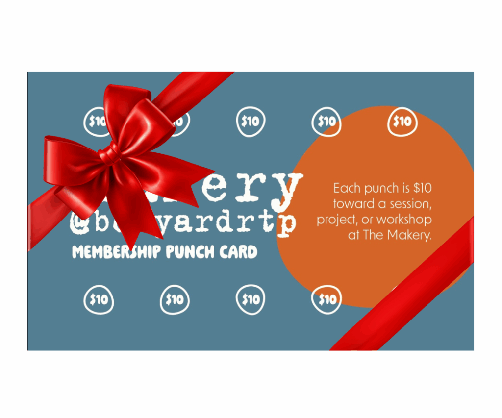 Punches function like prepaid credit in $10 increments. When you sign up for a project, workshop, or session, we simply round the cost up to the nearest $10 and subtract that number of punches from your card. Example: A $35 workshop uses 4 punches.